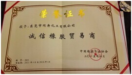 2015年11月6日,中國橡膠工業(yè)協(xié)會(huì)授予同舟化工“誠信橡膠貿(mào)易商”榮譽(yù)稱號(hào)。