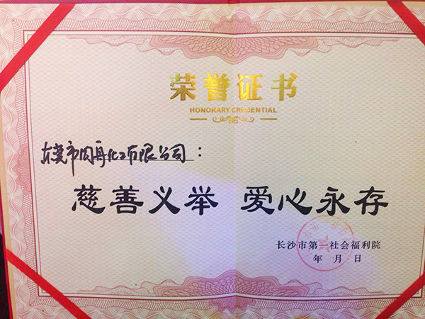 同舟化工榮獲長沙市第一社會(huì)福利院授予的“慈善義舉、愛心永存”榮譽(yù)證書。